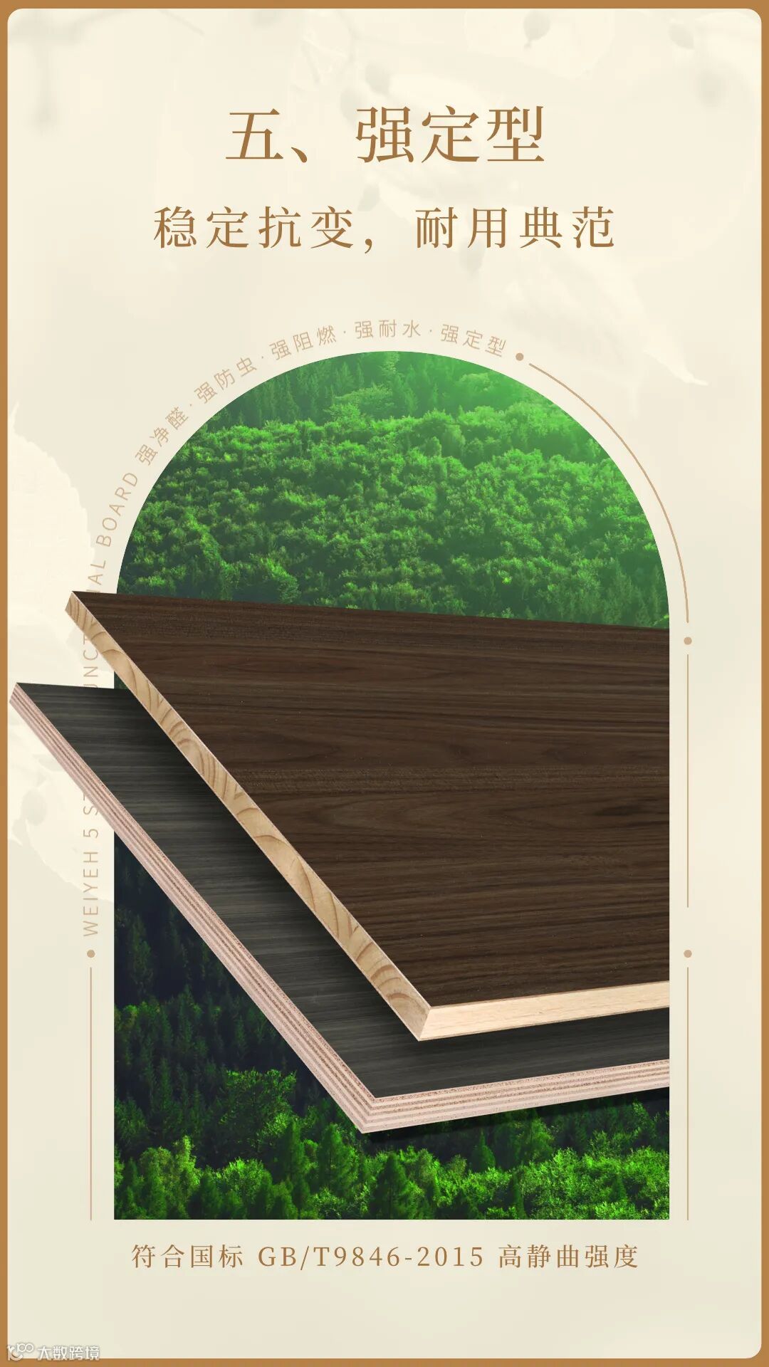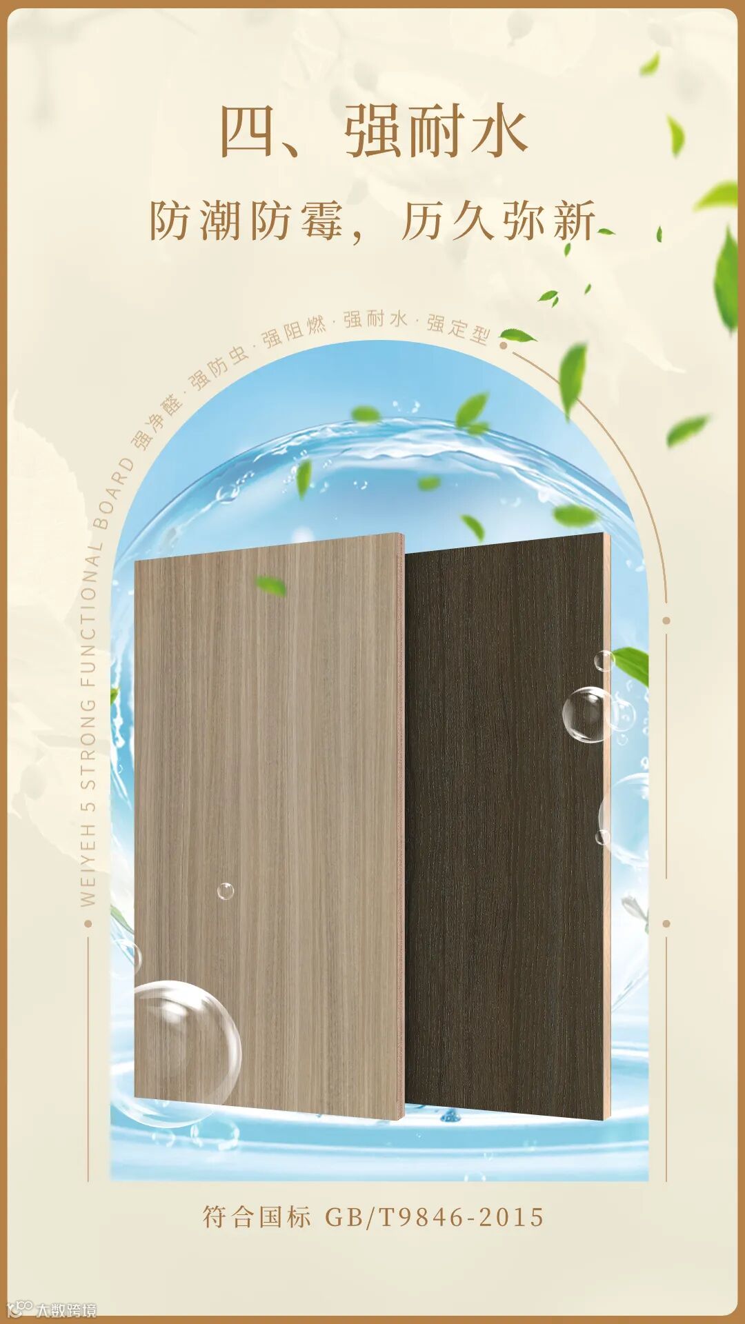 潮湿是家居装修的大敌,伟业五强功能板具有出色的耐水性能,轻松应对各种潮湿环境。它符合国标GB/T9846-2015二类标准,无论是厨房、卫生间还是其他易受潮的区域,都能展现出卓越的防潮防霉效果,让你的家居装修历久弥新。