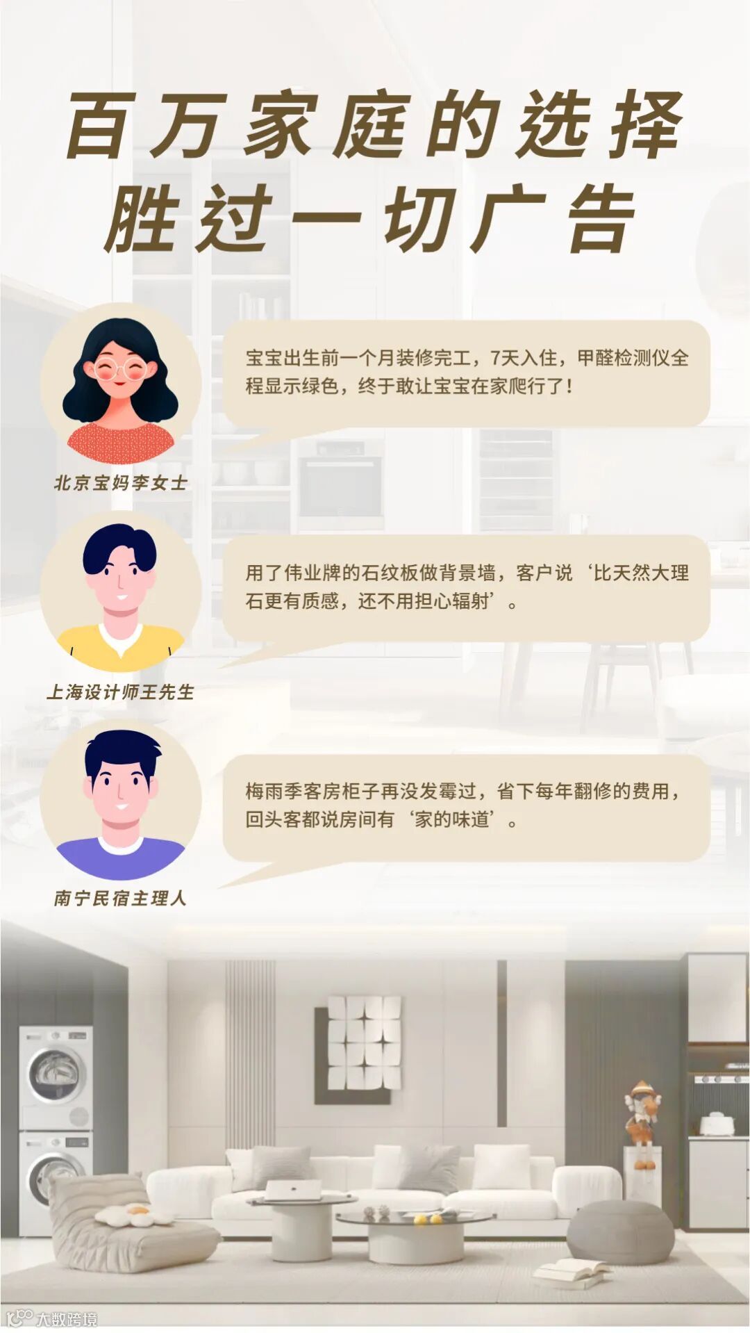 • 上海设计师王先生:“用了伟业牌的石纹板做背景墙,客户说‘比天然大理石更有质感,还不用担心辐射’。”