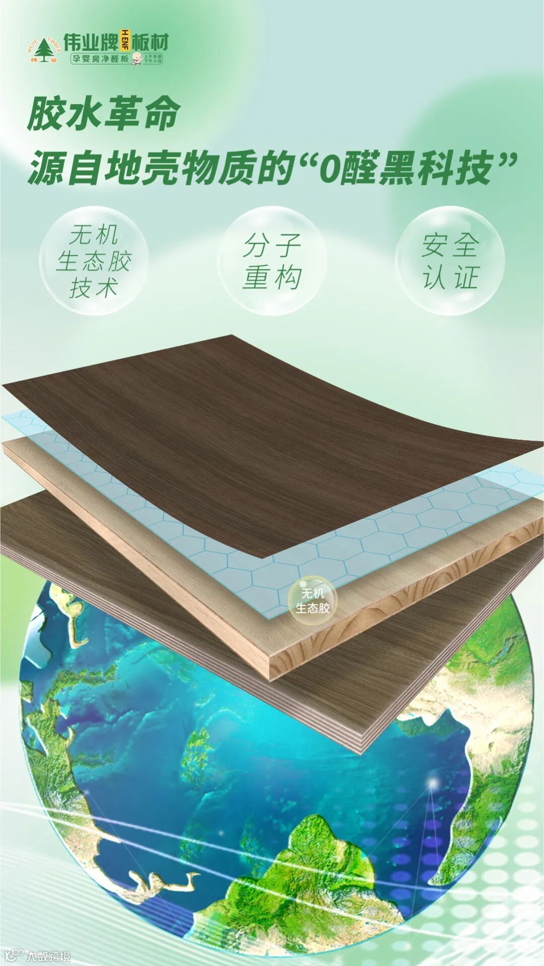 传统脲醛树脂胶(含甲醛量8%-12%)被彻底淘汰,伟业牌HENF板材添加 "无机生态胶" :