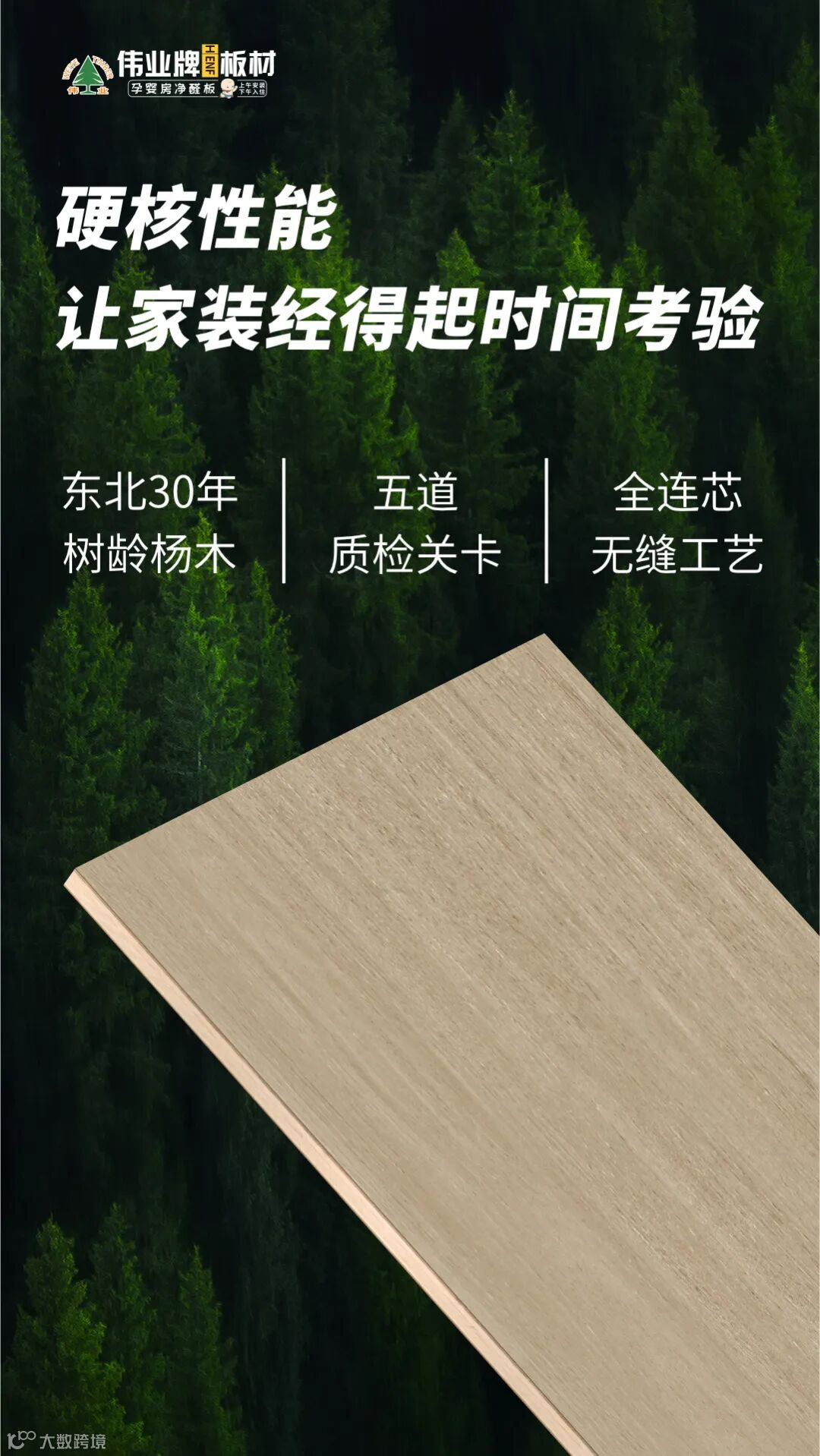• 东北30年树龄杨木:单一树种、密度提升35%,从源头减少结疤、豁边,膨胀率≤0.3%(国标≤12%)