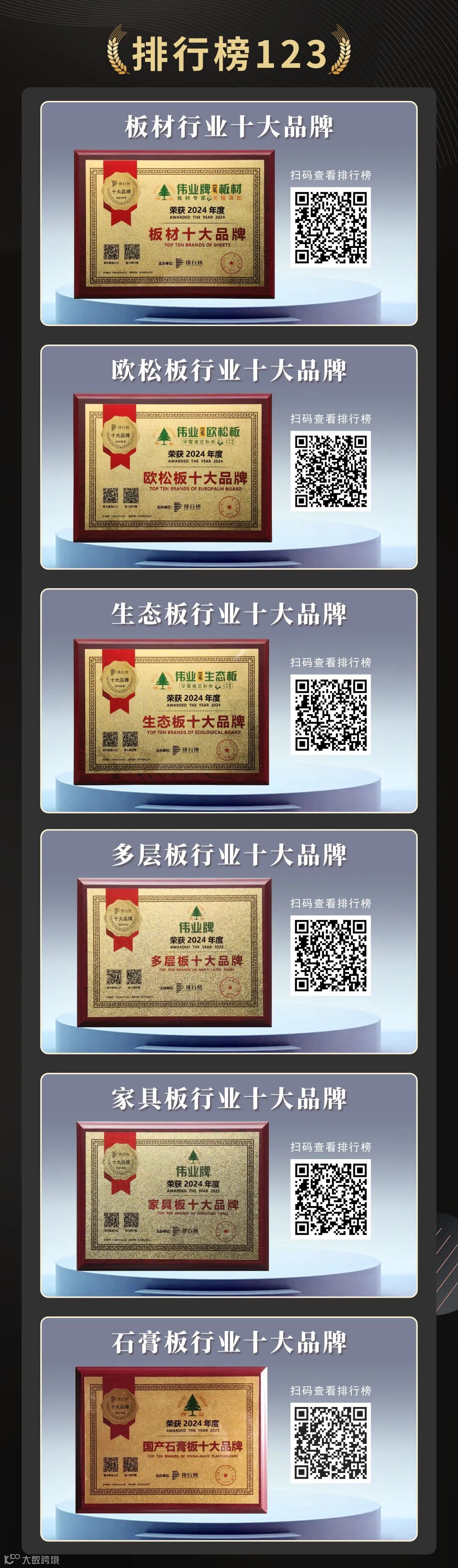 7月,伟业牌ENF板材在排行榜123公布分榜单中,凭借优异的表现,一举荣获“欧松板十大品牌”、“板材十大品牌”、“生态板十大品牌”、“多层板十大品牌”、“家具板十大品牌”以及“石膏板十大品牌”六项殊荣,充分凸显了伟业牌ENF板材在人造板行业中的卓越表现与广泛影响力。