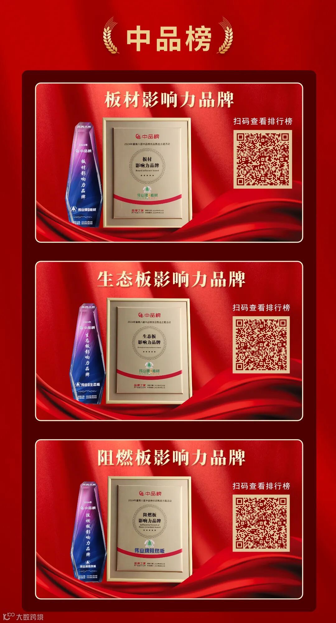 5月,第八届中品榜·十大品牌榜单隆重揭晓,伟业牌实力登榜,荣获“板材影响力十大品牌”、“生态板影响力十大品牌”、“阻燃板影响力十大品牌”,用实力捍卫荣誉,不仅是对伟业牌在人造板领域持续努力的肯定,更是对其在推动绿色建材发展方面所做贡献的高度认可。