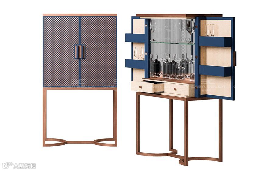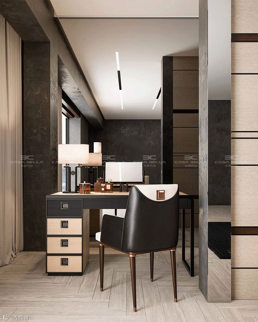 在细节的处理上,Cipriani Homood 运用不同材质,比如烤漆木面、原木色面、纹理饰面以及深浅颜色、隐藏式金属拉手的设计,通过质感和颜色的组合形成不同层次的视觉和触觉感知,并以此为主线串联了一整个系列的家居和生活空间。