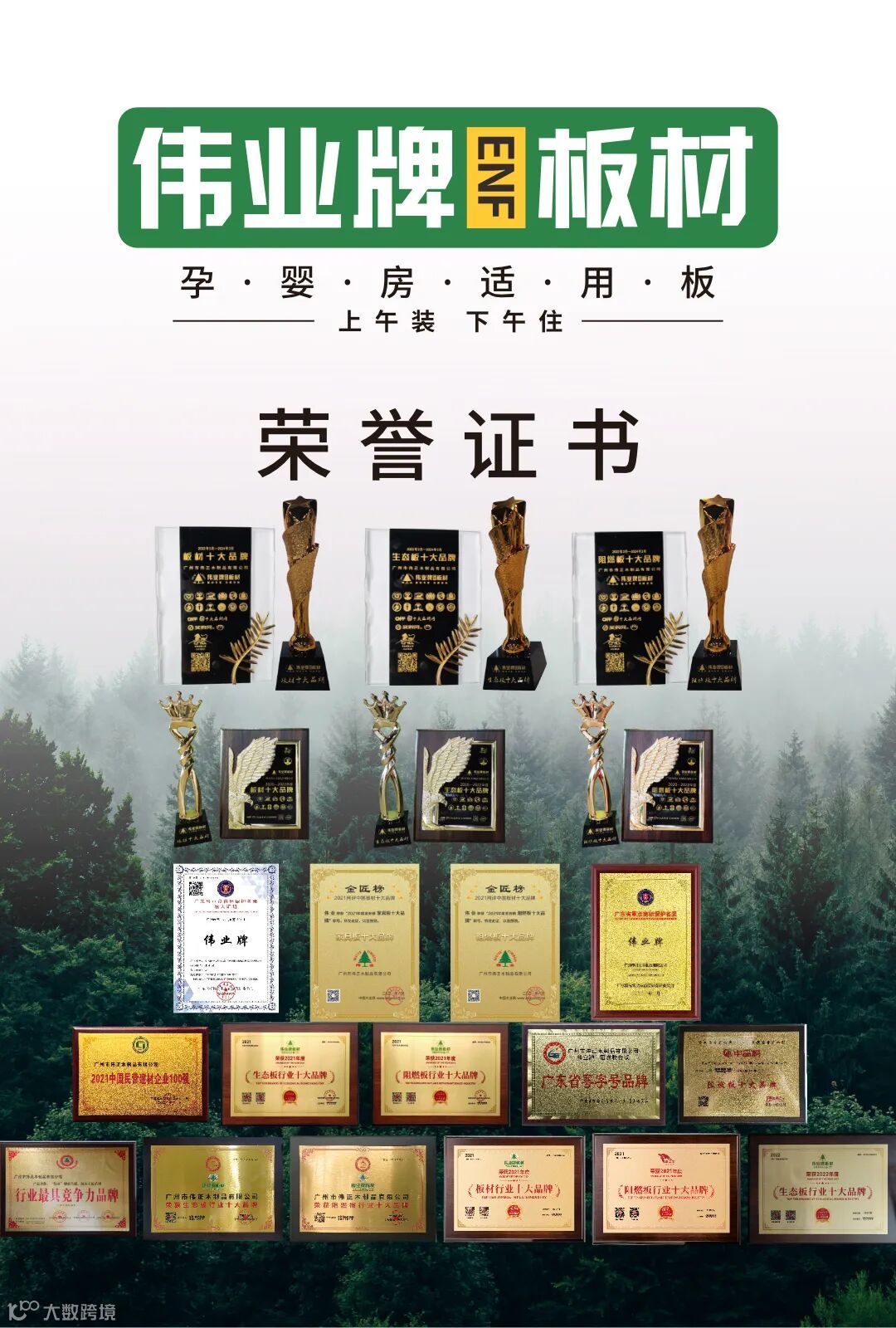 伟业牌ENF板材在将近30年的发展中,以品质立身,获得荣誉数不胜数,获得广东省名牌、广东省著名商标、粤港澳大湾区品牌100强、中国民营建材企业100强、板材十大品牌、欧松板十大品牌、生态板十大品牌、阻燃板十大品牌、家具板十大品牌等称号,经受住了时代和市场的多重考验,积累了深厚的品牌信任,成为千家万户有口皆碑的品质之选。