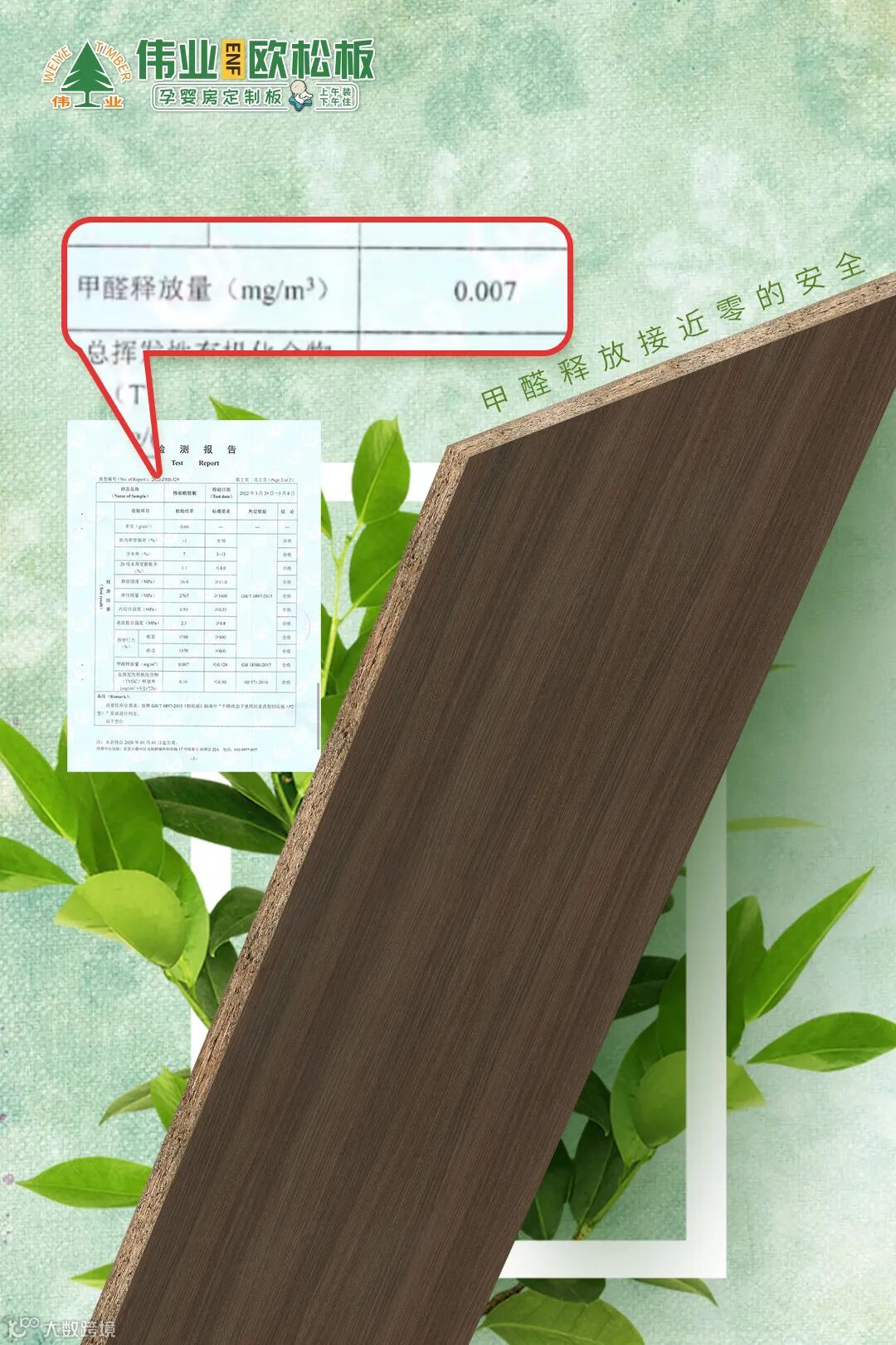 伟业ENF欧松板全系产品采用MDI胶水,属于非醛类生态胶水,不含甲醛、苯酚等有害的物质,产品高于国标新标准ENF级(≤0.007mg/m³),成为国内欧松板行业ENF级领导者,确保了产品出色的环保性能。