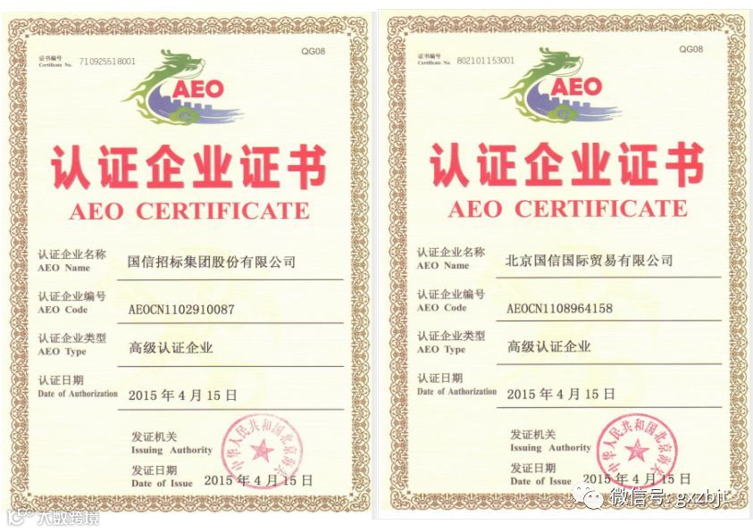 国信招标集团及北京国信国际贸易有限公司,于2011年双双荣获海关颁发的双A企业资质,并于2015年荣获海关《高级认证企业证书》(简称AEO证书)。同时,两家公司均为北京市外汇管理局、北京市税务局A类企业信用等级。
