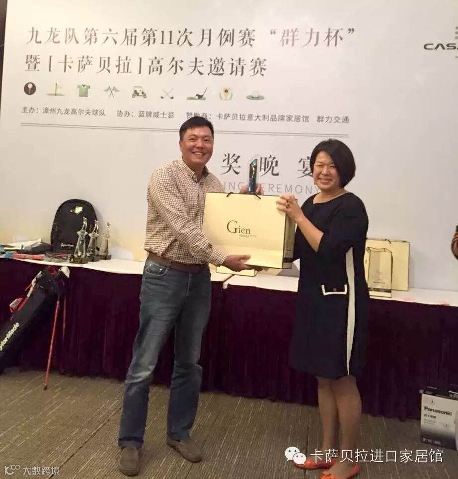 九龙高尔夫球队的精英悉数到场,历时一天的激烈角逐,各大奖项竞相出炉。夜幕刚落,邀请赛颁奖晚宴温馨开场,卡萨贝拉意大利品牌家居馆董事长贺晓红女士作为嘉宾出席并应邀上台致辞,作为本次赛事的合作伙伴,卡萨贝拉也为获奖选手精心准备了珍贵奖品,来自法国轻奢进口陶瓷Gien的限量版作品。
