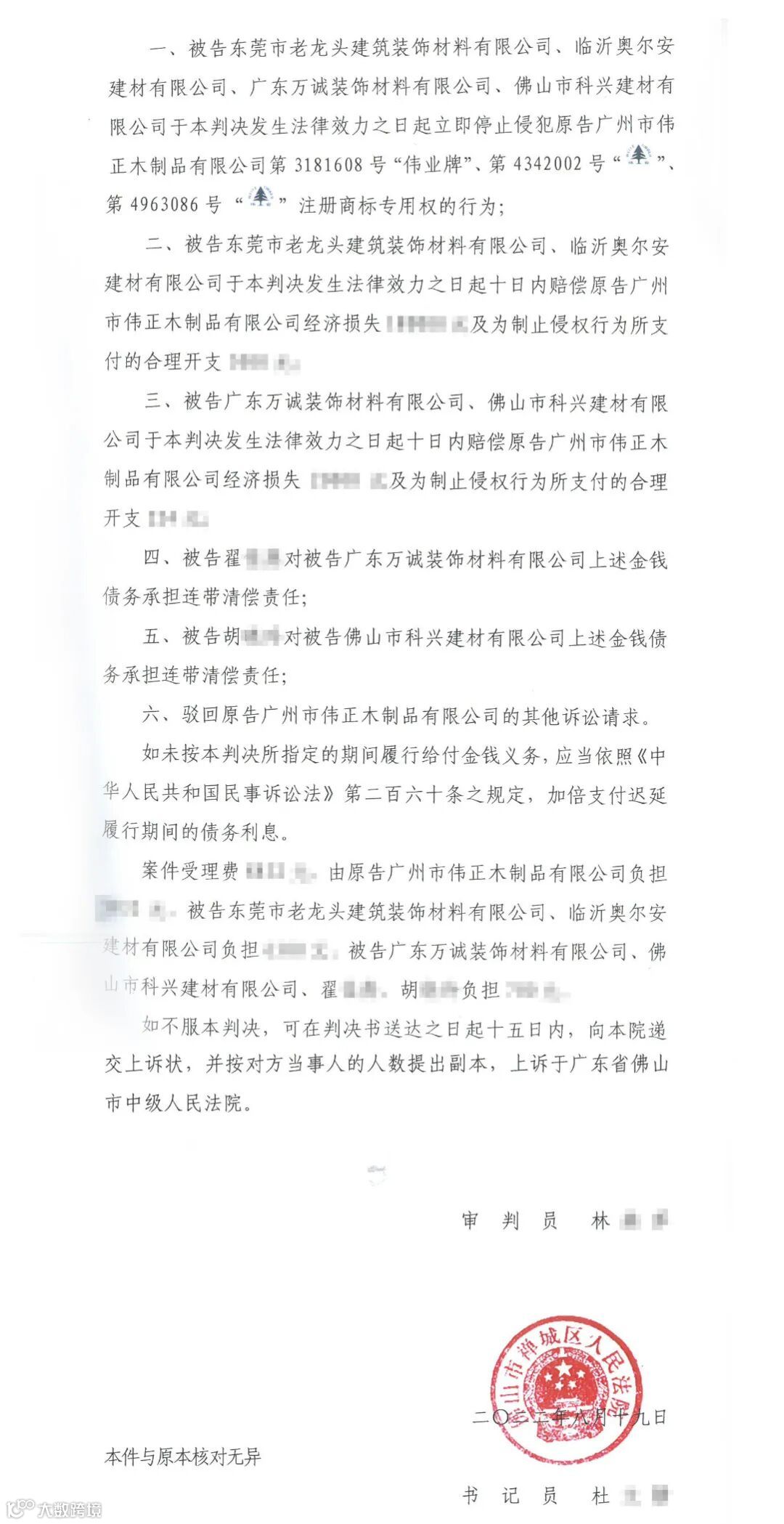 一、4被告于本判决发生法律效力之日起,立即停止侵犯原告伟正木业的第3181608号、第4342002号、第4963086号注册商标专用权的行为;