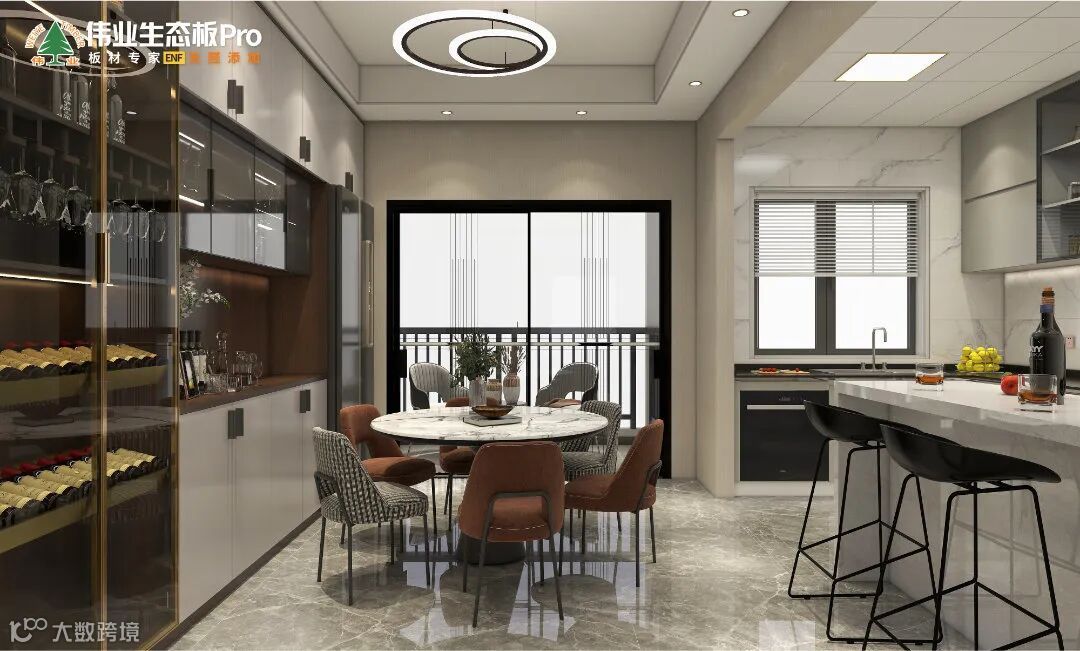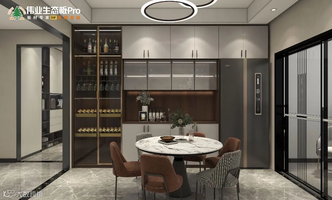 轻奢新主义,用半开放式餐边柜“填充”墙面空间,冰箱内嵌,选择大理白餐桌,搭配圆环造型吊灯,材质相互呼应,质感丰盈,实用与颜值并存。