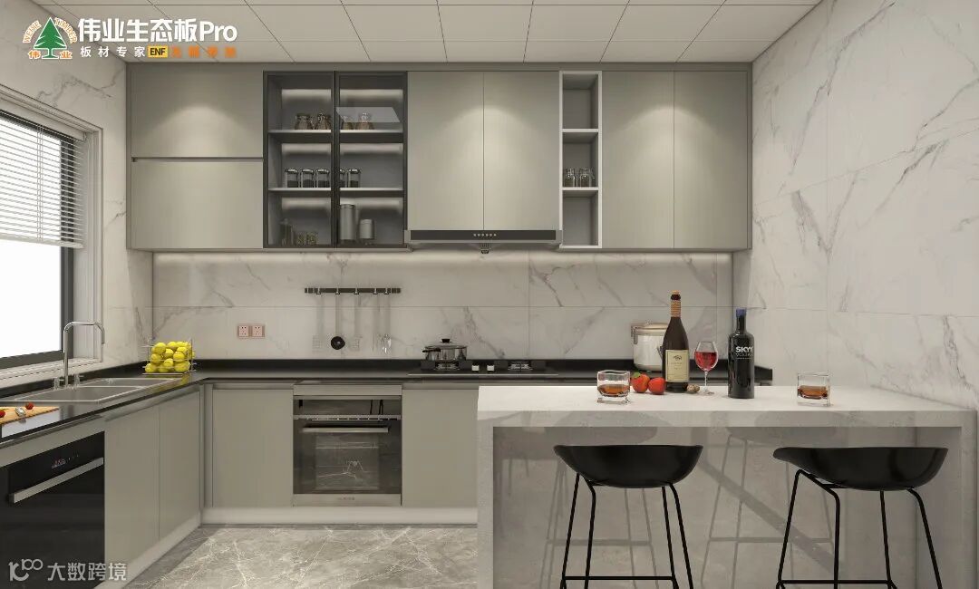 灰调自带时尚与个性的属性,电器一律采用镶嵌的方式,增强整体效果,小吧台延伸厨房使用空间,优雅的灰调+大气的岩纹,更显高级感,完美平衡了奢华与功能。
