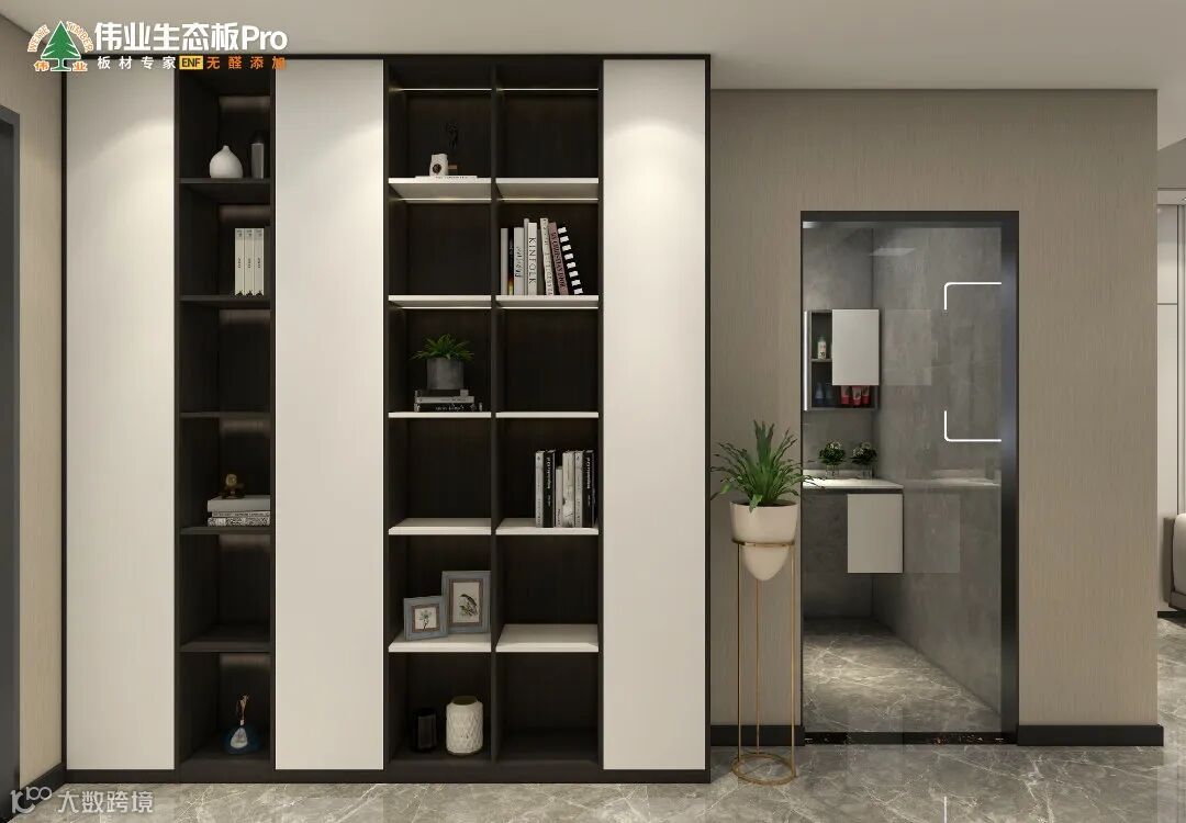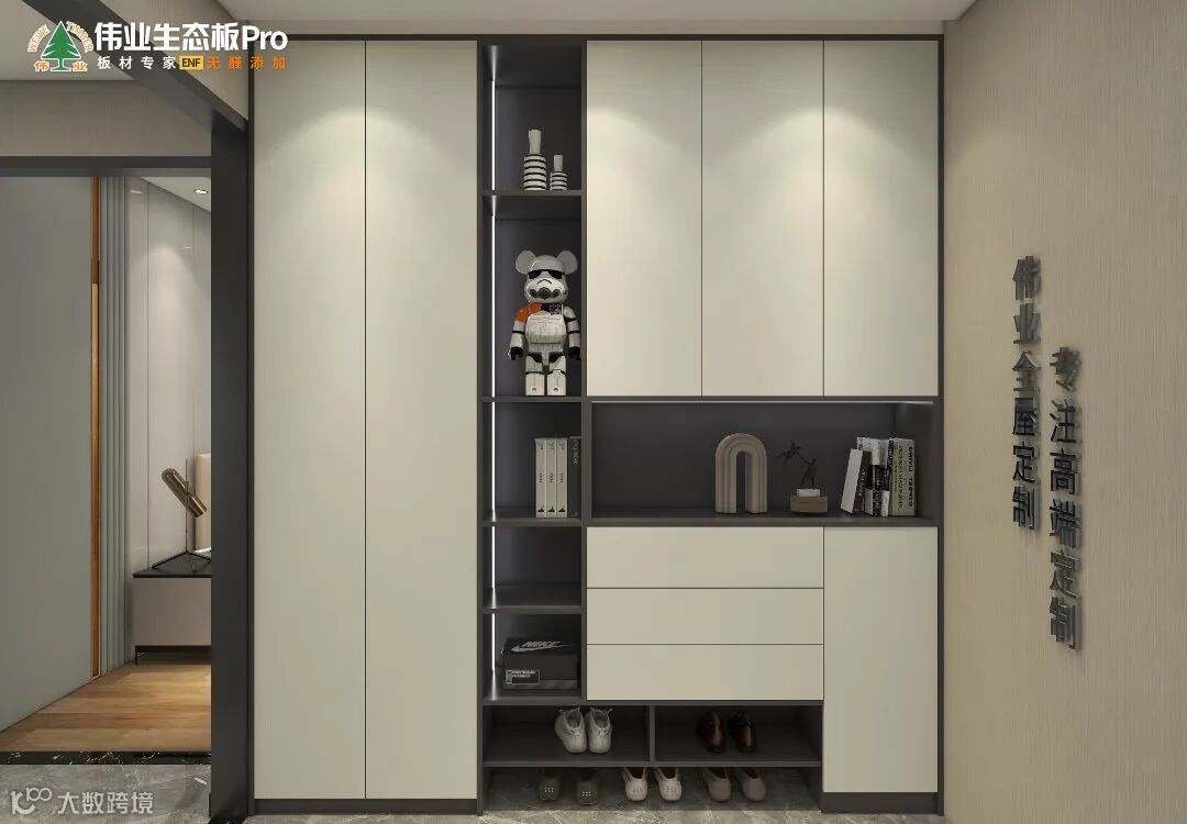 鞋柜简约大方,开放+半封闭格局,底部留空,一能实现多功能收纳,二能装饰空间,大大提高玄关的美观度和实用度,让回家的那一刻就有仪式感。