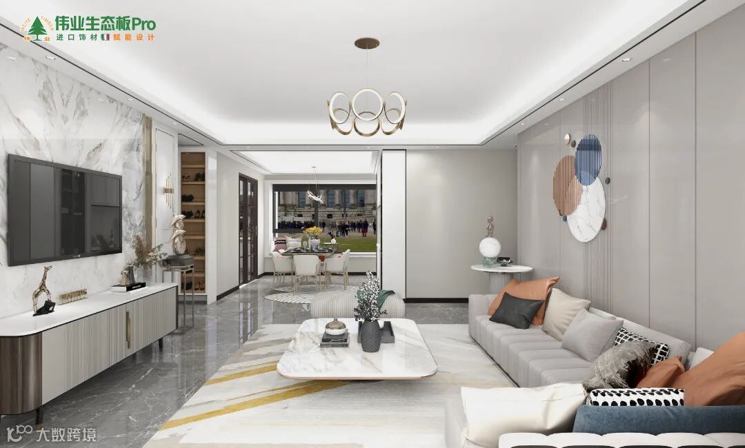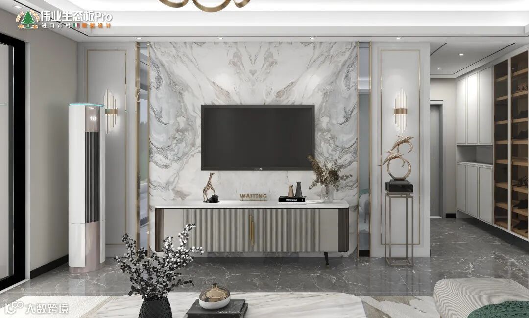 打破僵化思维,电视墙巧妙融入轻奢的理念,运用不同元素的质感、肌理,达到空间的极致平衡。