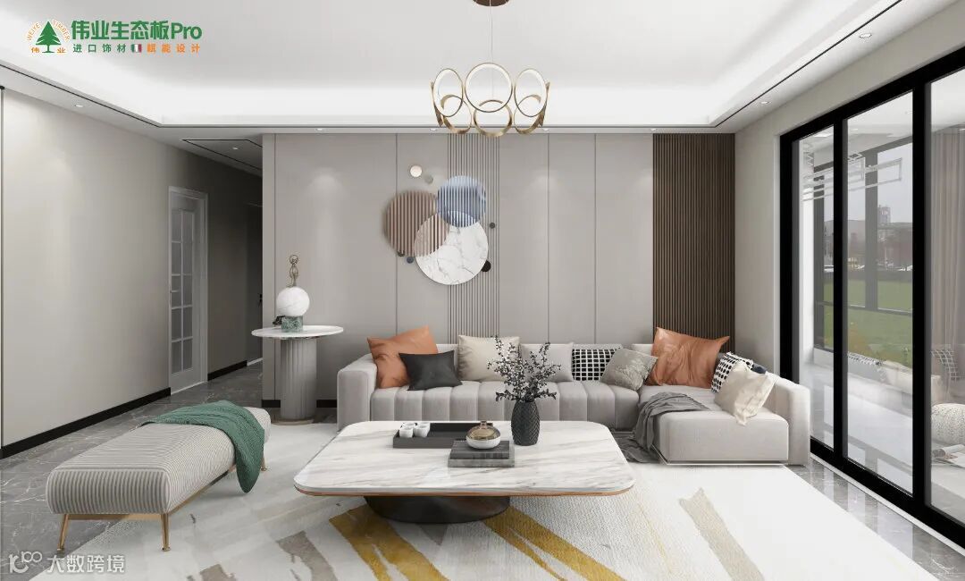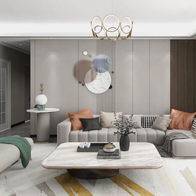 L型的绒质沙发、方形的茶几、生机的绿植、环形的吊灯,一件一物,都流露出优雅的气息,诠释精致的生活态度。