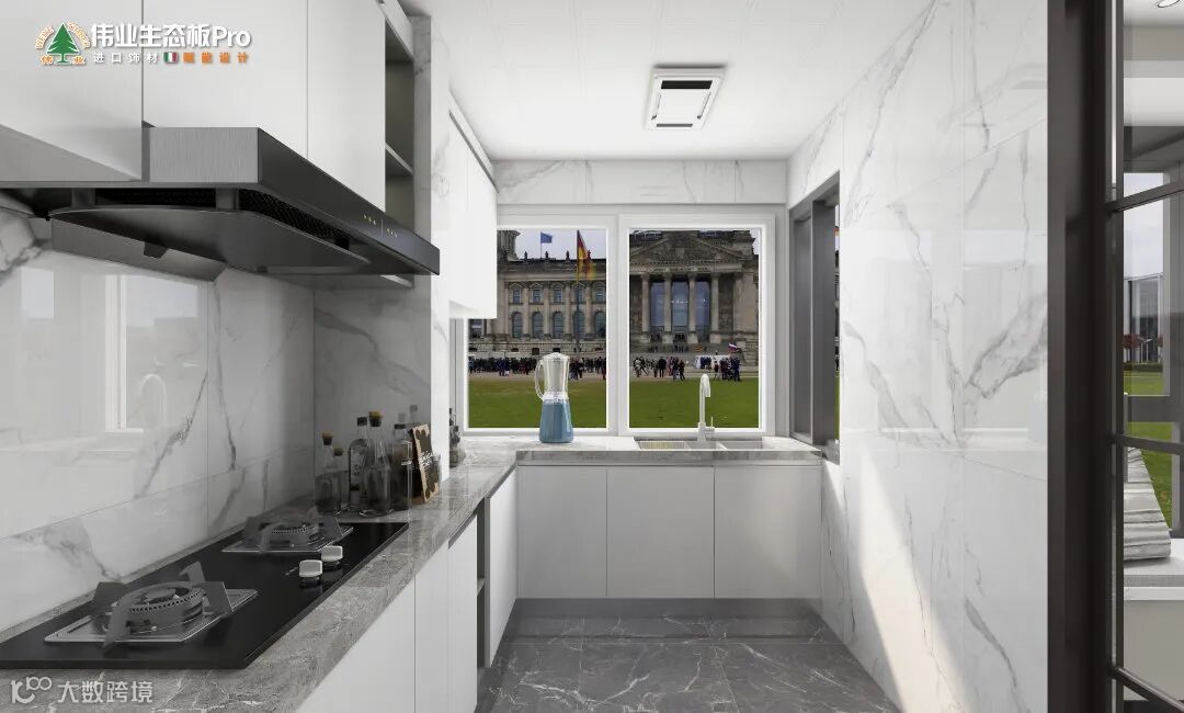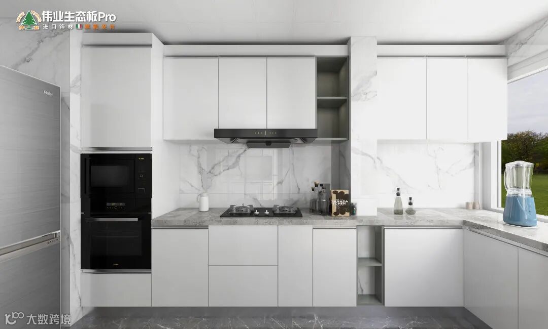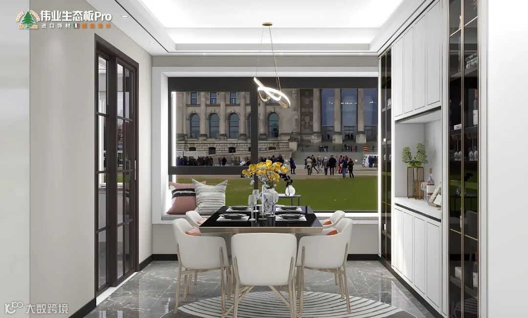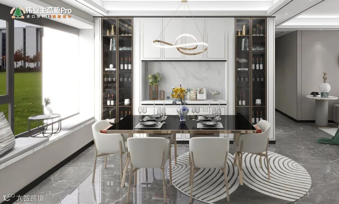 空间以用餐和收纳为主,靠墙定制到顶餐边柜,中央摆放条形餐桌,黑白灰三色相辅相成,无论色彩、外观还是材质,都透露出由繁到精、由奢到简的高级感。