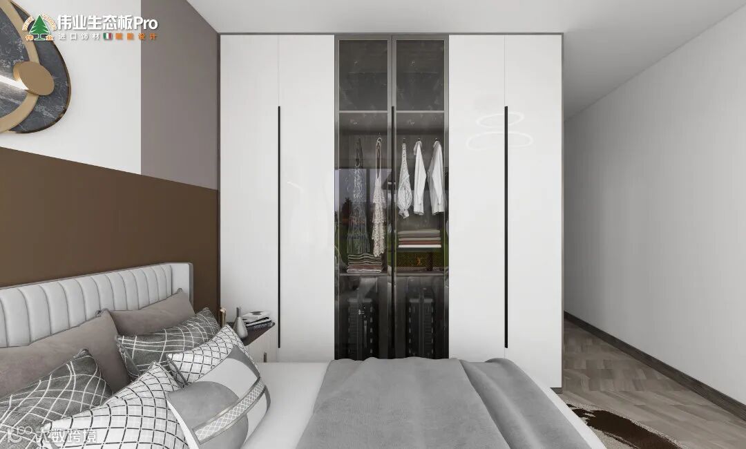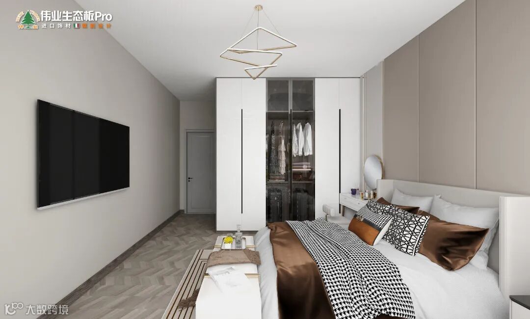 融入极简的思维,对称的通顶衣柜、金属的灯具,带来了奢华和质感,视觉上也更加开阔明亮,合力营造舒适、温馨、自然的睡眠环境。