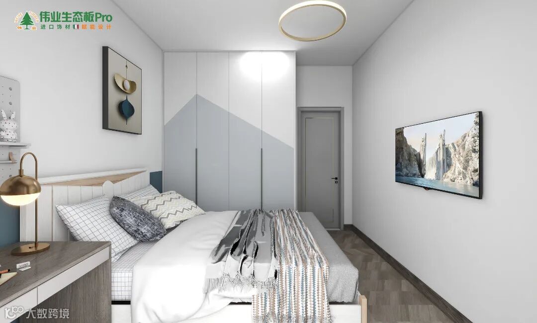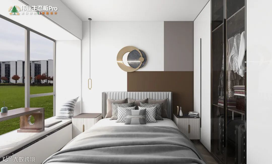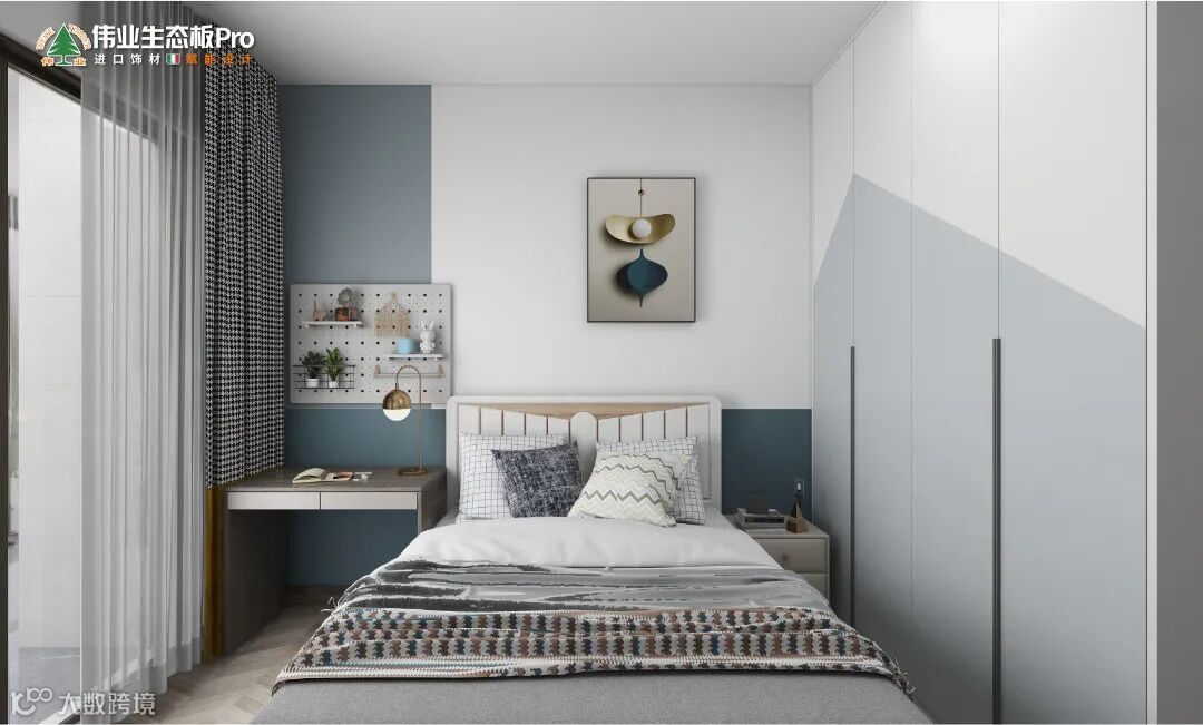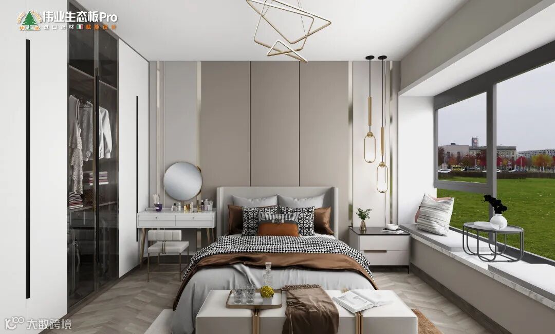 用拼接组合的形式,床头墙变幻出层次感,衣柜简洁大气,充满立体感,飘窗引光入内,一室温暖,洗涤尘埃,安抚心灵。