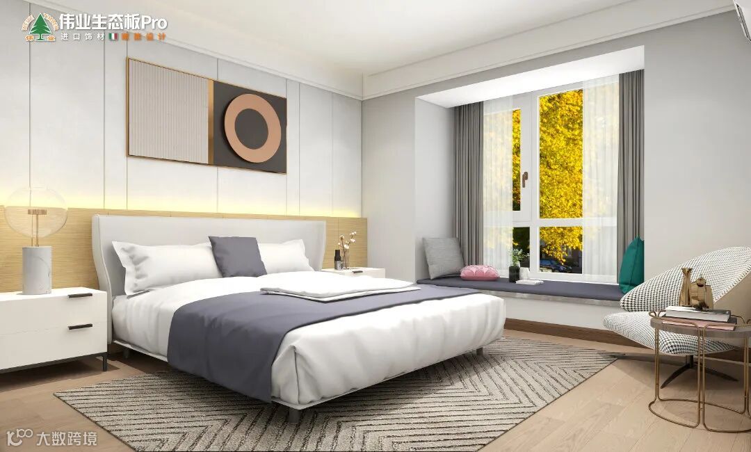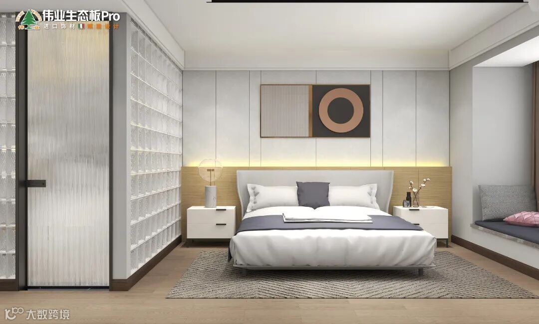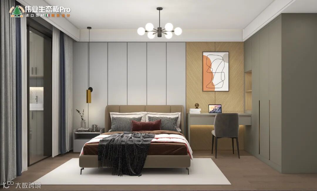 次卧注重简介和舒适,床的平行面做衣柜,延伸出书桌设计,打造木饰面的书桌背景墙,挂上艺术画,点燃空间的艺术氛围,书桌+收纳整体形成L型结构,为空间带来更宽阔的活动面积。