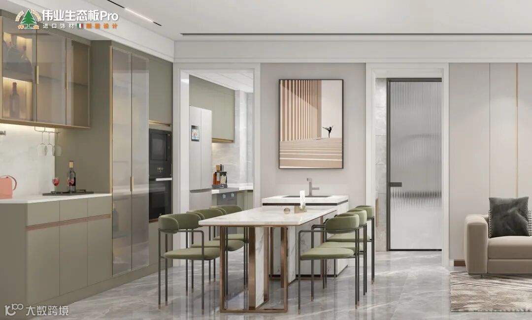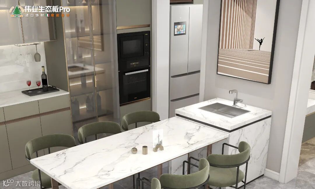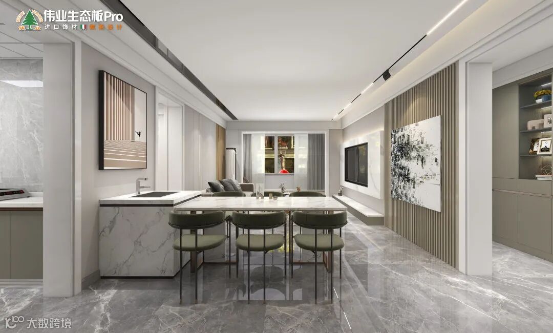 餐桌+岛台一体化的设计,岩板的餐桌、皮质的餐椅,在极简外表下隐藏“轻奢”的气息,满足就餐、派对、品酒、聚会等家庭需求,让居家生活演绎更多社交的可能性。