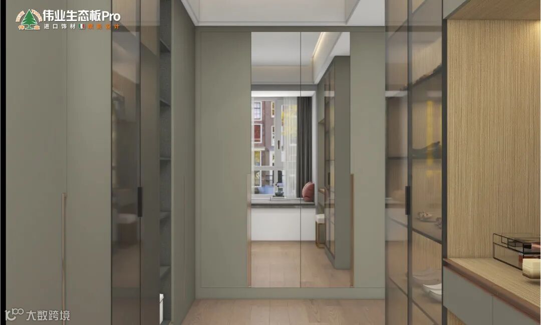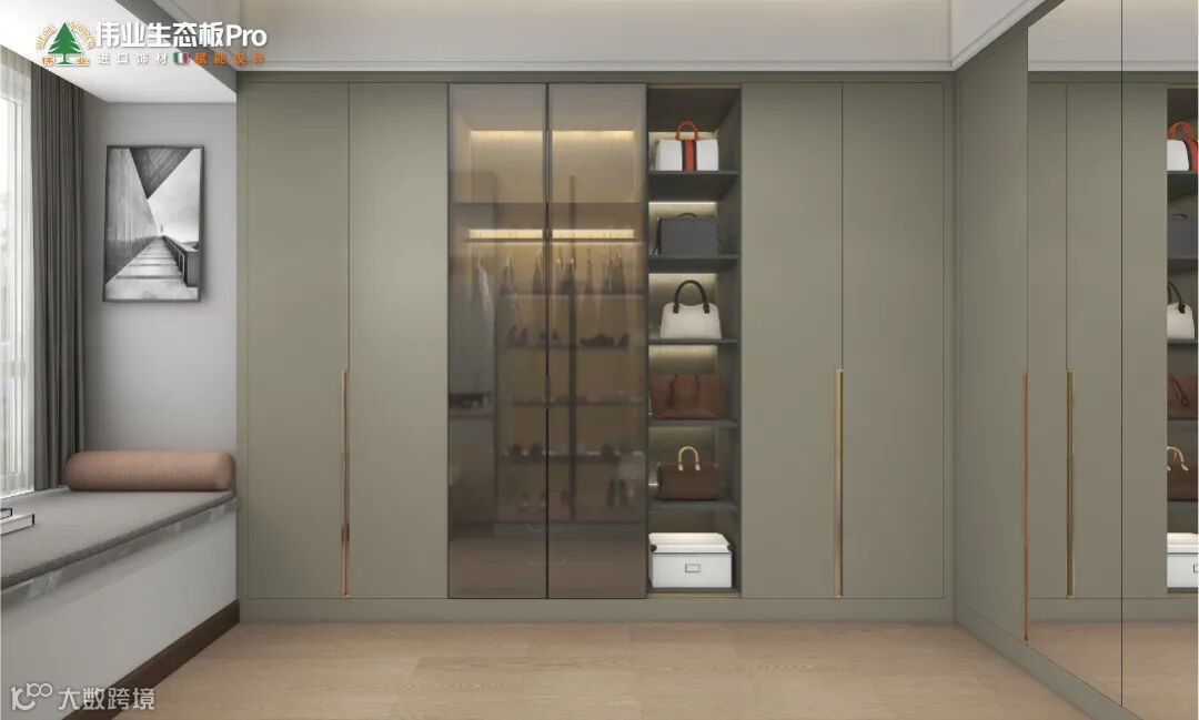 轻奢系衣帽间打造双边布局,融入放鞋区、化妆桌、展示区、挂衣区等功能设计,让衣帽间繁而不乱,井井有条。同时采用玻璃门+灯带系统,带来梦幻、精致的感觉。