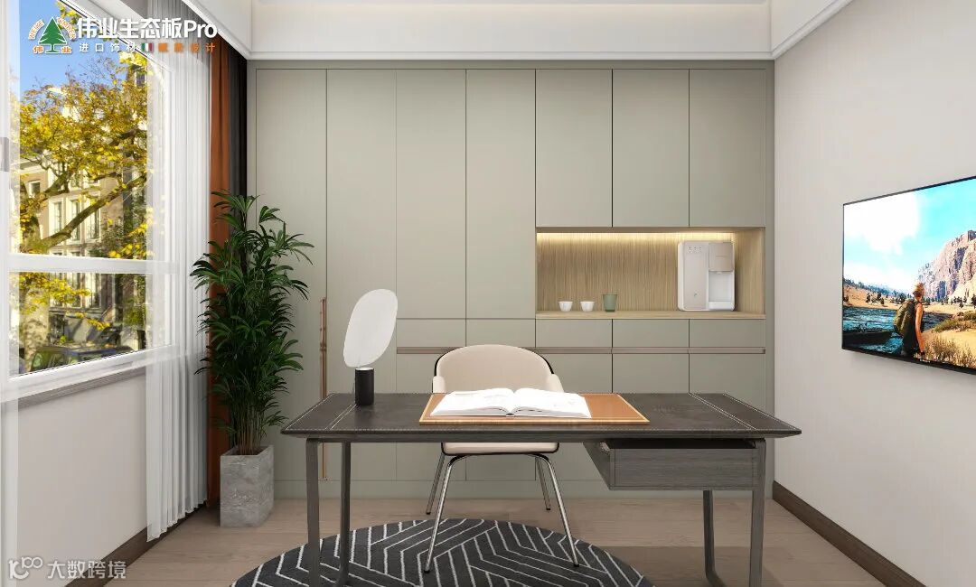 小客卧设计成书房,中央摆放书桌,靠墙定制收纳柜,运用了大量封闭空间,使得收纳柜在感官上更像背景墙,留白墙壁挂上电视柜、艺术画,让房间的功能更加多样化。