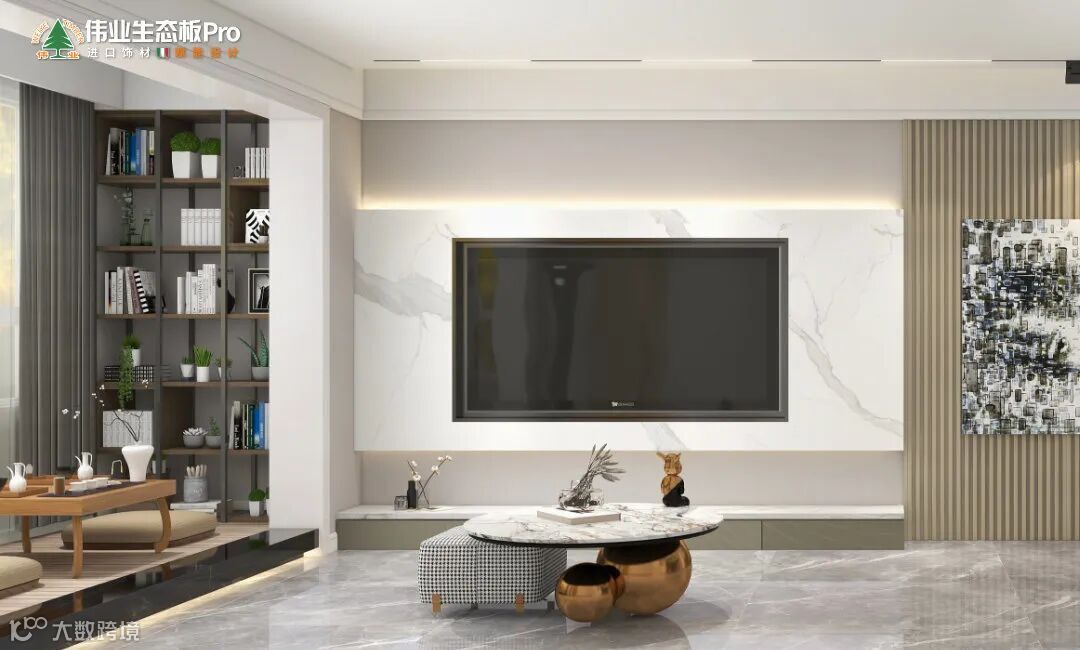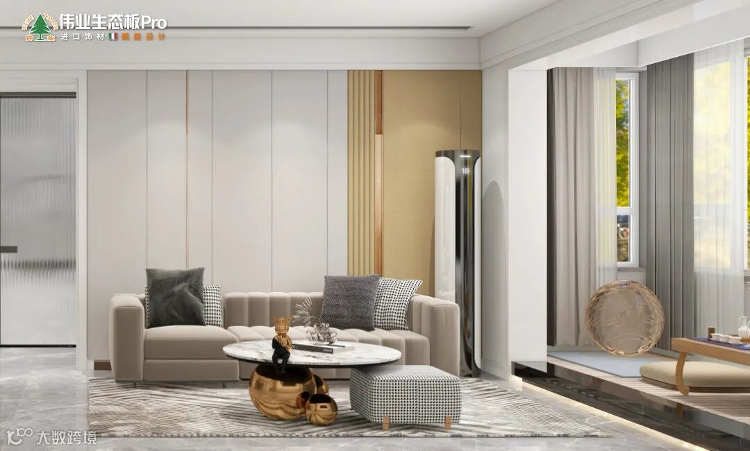 客厅与餐厅相连,电视嵌进背景墙中,侧方是格栅+抽象画,产生了奇妙的美学反应。三七比例拼色的沙发墙,搭配灰绒沙发、圆形岩面茶几,简洁干练的线条,让空间更为整洁。