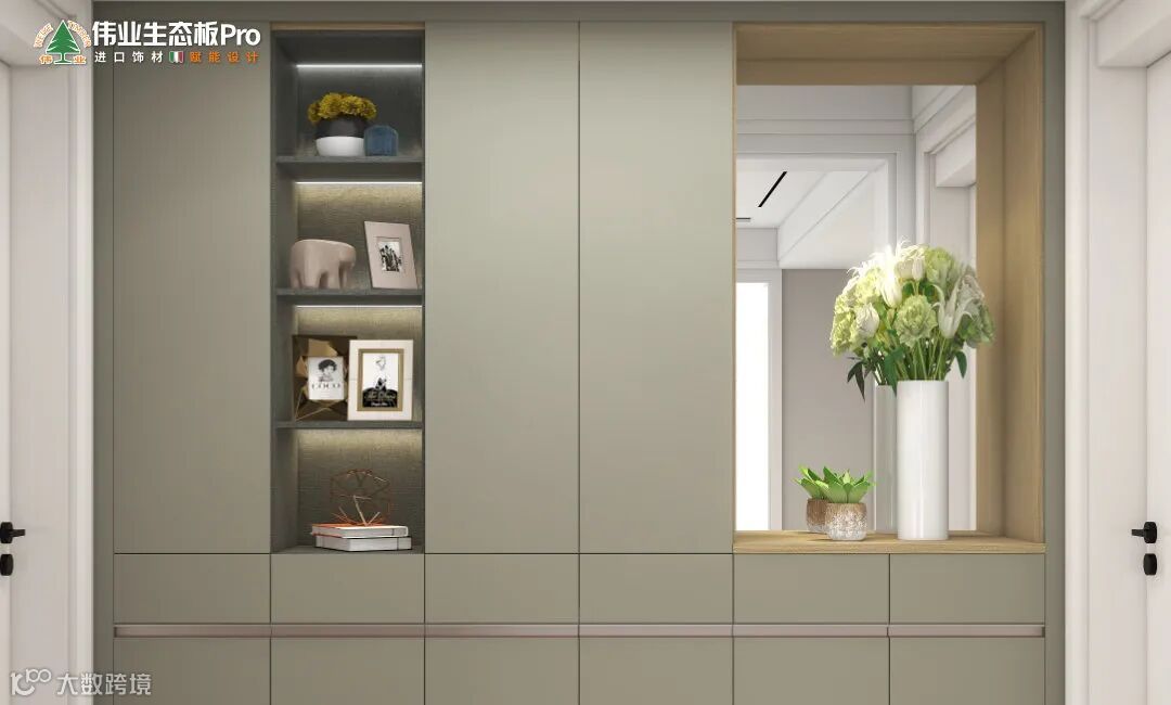 进门即餐厅,靠墙打造储物柜,底部做封闭鞋柜,防止串味。中间展示区摆放包包等物品,方便进出门。L型藏酒区安装玻璃门,让名酒一览无余。