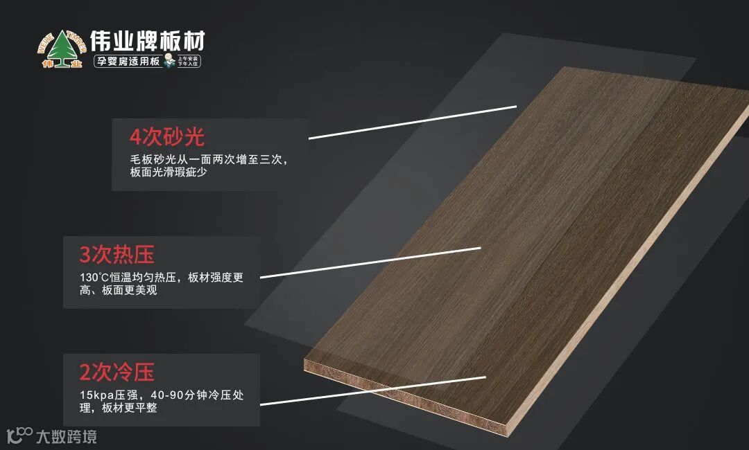 伟业牌板材由全自动生产线精制而成,表层和芯层规律配比,4次砂光,毛板砂光从一面两次增至三次,板面光滑瑕疵少;3次热压,130℃恒温均匀热压,板材强度更高、板面更美观;2次冷压,15kpa压强,40-90分钟冷压处理,板材更平整,保证每一张板材品质始终如一,没有个体差异。