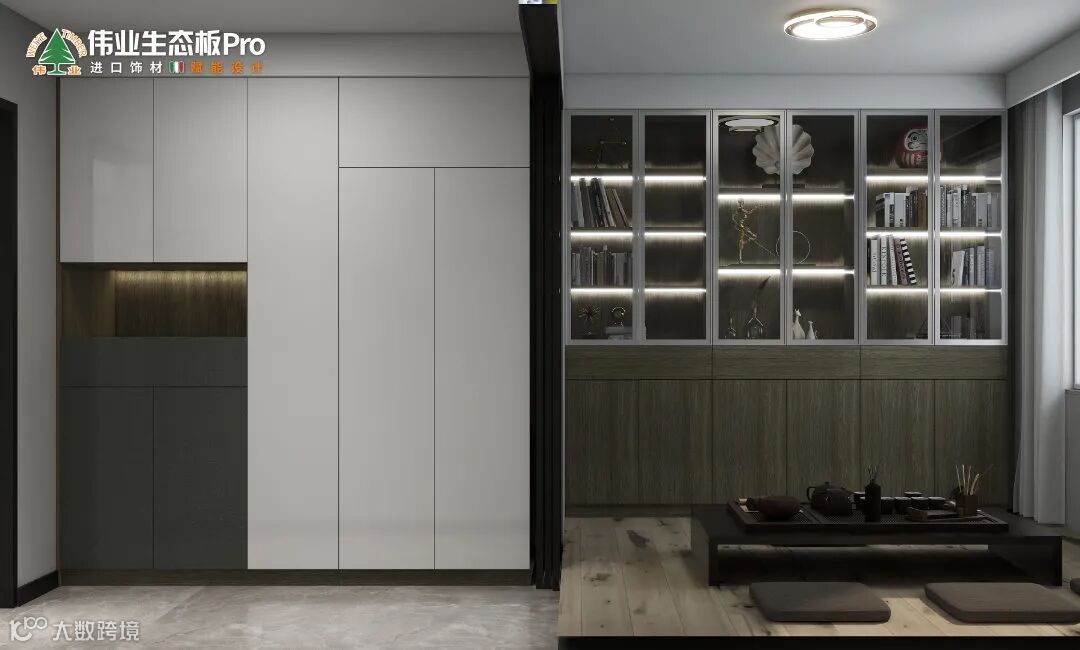 充分利用书房过道,定制通顶柜,扩充家居收纳能力。书房打造成休闲小茶室,地面做地台,整墙展示柜+茶桌茶具+坐垫,一间茶室,一隅宁静,读书喝茶两不误。