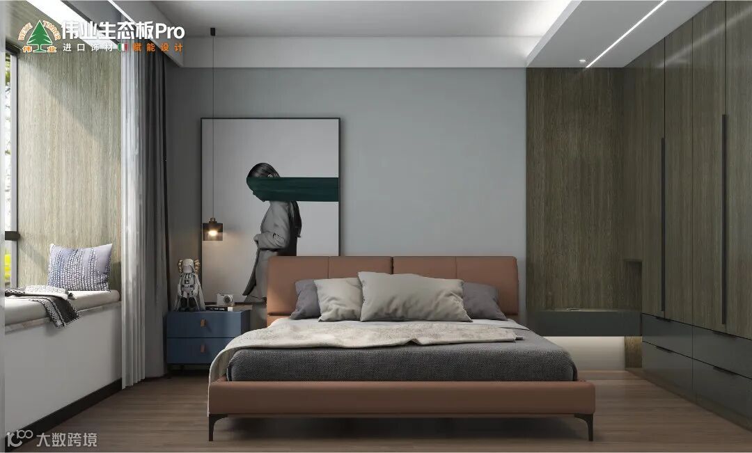 卡其+白构成床头墙,打破墙面的单调性,深灰+白组成到顶衣柜,里侧做开放格+床头柜设计,丰富使用功能。抽象挂画的加入,瞬间成为焦点,为空间注入朝气感。