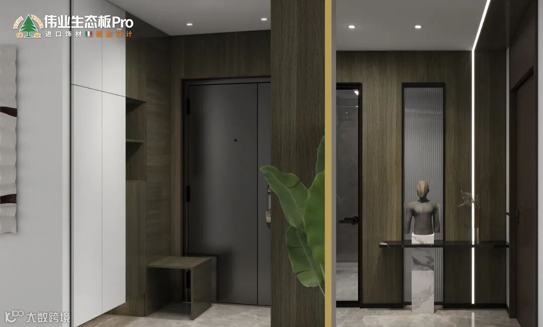 入户以深灰为主,白色作为过渡色,纯白的细腻感、原木的自然肌理,二者互相铺陈,令空间充满色彩的张力,两层展示格、底部悬空、移动换鞋凳,让进出门更便捷。