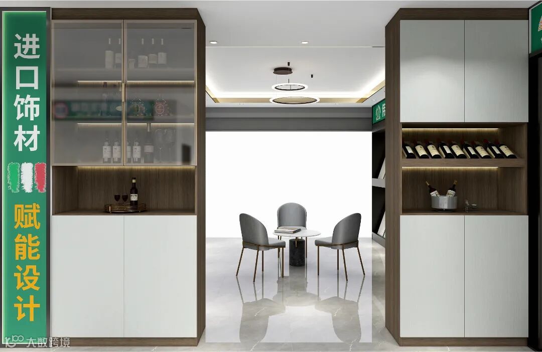 名酒配好柜,一字型的酒柜选择D102春雨江南作为底色,精美的木纹、沉稳的色调,赋予空间别致的美感,与Y04月银白油脂的碰撞,更显时尚与简约,线条简洁流畅,功能齐全,对空间要求不高,无论大小户型都适用。