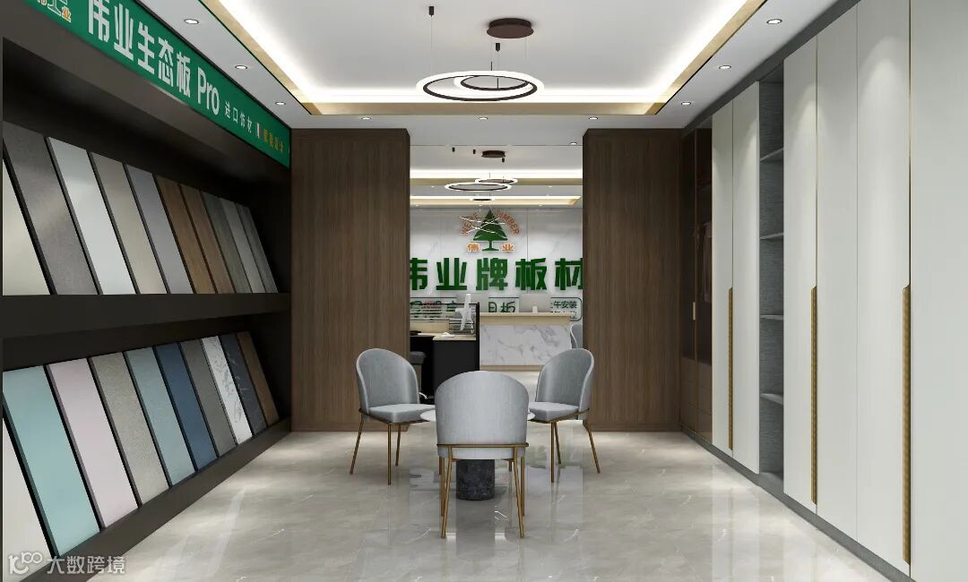 店面由板材、定制家具两大展示区组成,可以细分为产品展示区、前台、品茶区、工作区等,布局上全面考虑展示产品的特点,以多条动线分割出不同空间,既充分展示板材花色,又为消费者带来身临其境的定制家居空间体验。
