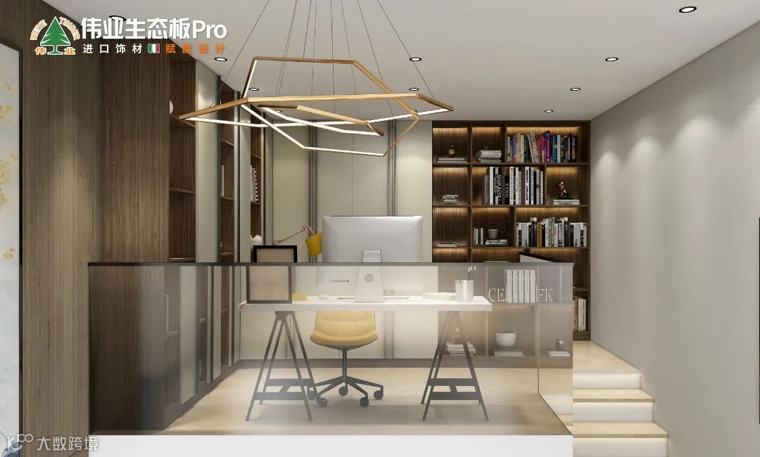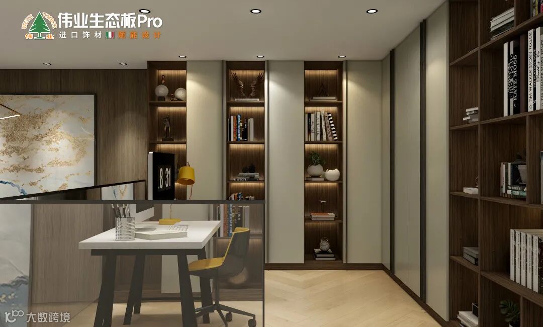二楼的另一个空间是书房,利用优雅的Y04月银白油脂、内敛的D115热带雨林,设计成L型半开放式书柜,封闭柜体安装长条拉手,展示格嵌入暖色灯带,营造出惬意自然的办公氛围,构成一个整洁有序的书房空间。