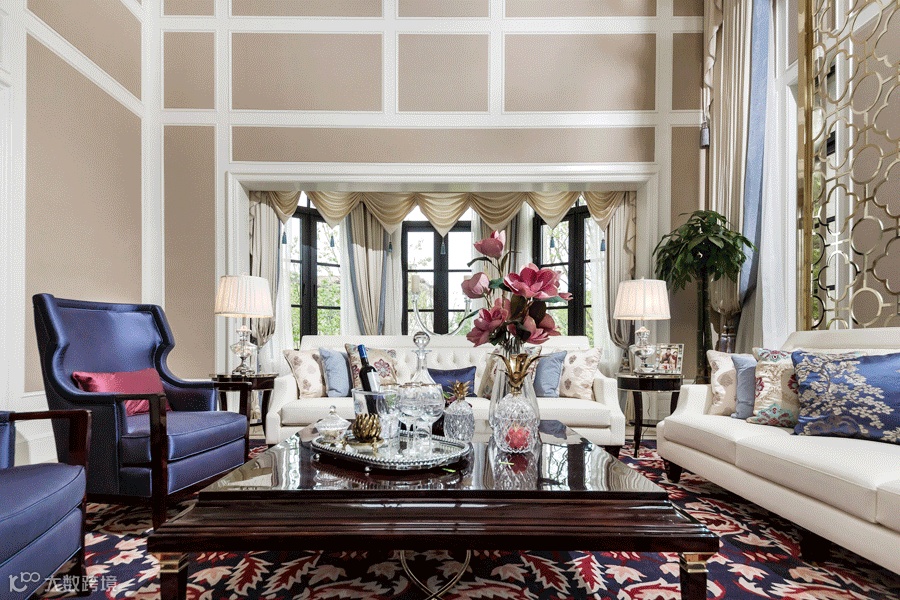 在这个簡約、優雅的独栋别墅,整體以米白、褐色作爲空間設計表達,海天藍、藕荷色等富有藝術的配色處理又賦予空間動態的韻律和美感,花線圍身塑型讓空間顯得更高立體、活力,準確描摹出主题式设计统一的雅貴氣質。圖案精美的地毯、金屬雕花屏風、三兩藝術裝飾等等不同元素的融入,讓空間變得更加多元而豐富。