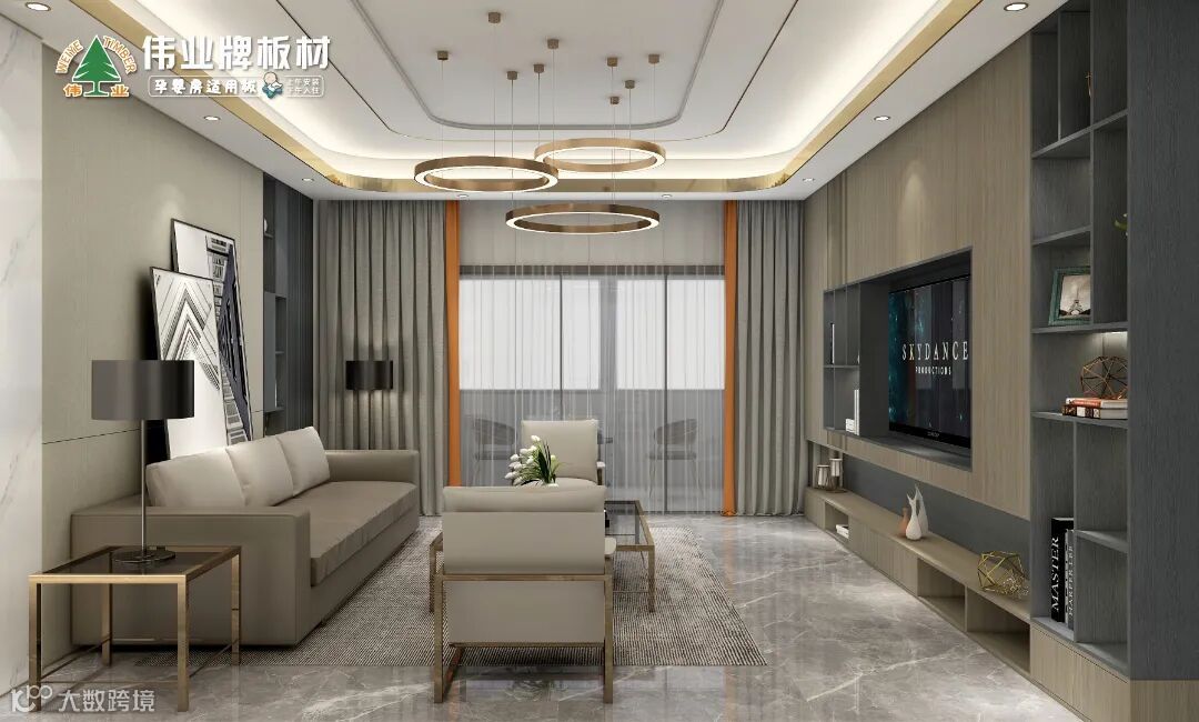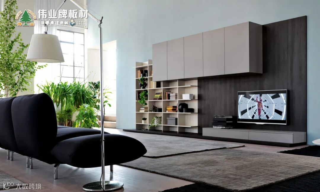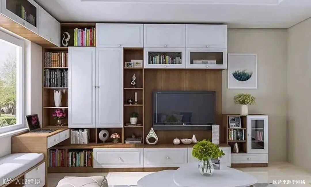 整墙定制电视柜,采用到顶封闭式的设计,收纳功能强大,能容纳99%的客厅物品,储物量堪比5m2的小卧室,可以添加展示格、玻璃门、隐藏带灯、悬空等设计,既能展示装饰品,又可以避免空间压抑,让整个客厅更加赏心悦目。