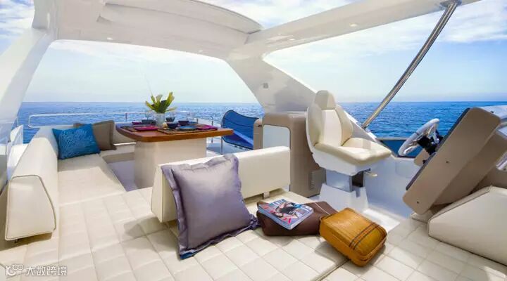 时尚领袖: Azimut66一如既往的采用了特有的淡蓝光发射玻璃,典型的鲨鱼鳍舷窗配以流线型外观设计,俨然一副时尚领袖傲屹群芳。