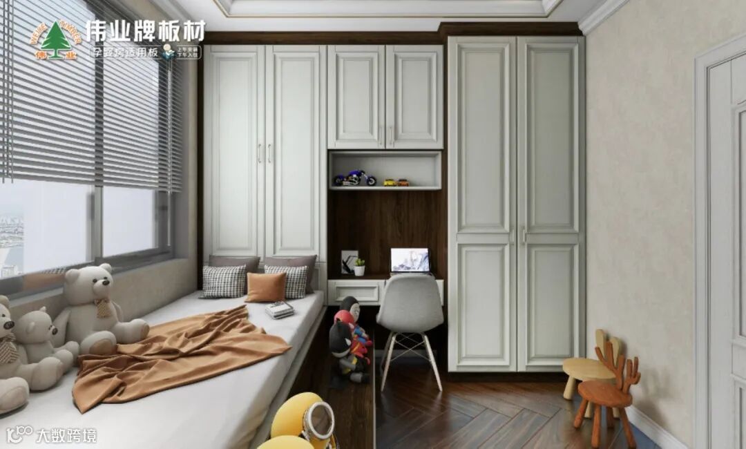儿童的免疫力弱,房间装修要选用环保板材,才能保证孩子安全健康。伟业牌板材专注板材25年,E0级环保,净味安全,为儿童的健康保驾护航,深获万千家庭信赖。