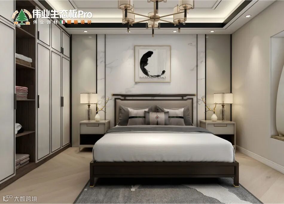 主卧融入极简的特色,去掉具象的堆砌造型,213大理白-火烧和W-A207珍珠中灰组成护墙板,整体恢弘大气,221黄桃-超哑和211麻石白-火烧打造到顶的衣柜,利用水墨壁画、陶瓷花瓶等元素,为空间注入写意的气息,无意中增加了新中式的诗意和温柔。