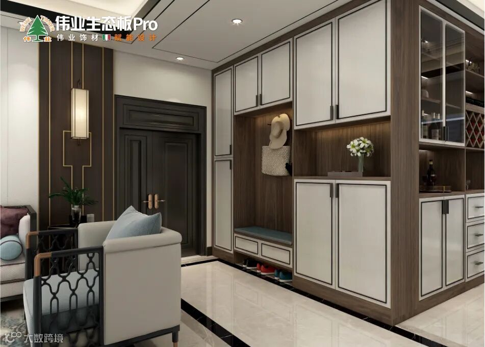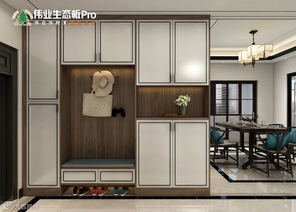 玄关是一字型到顶鞋柜,兼顾功能与美学,开放和隐藏融为一体,以古朴的221黄桃-超哑做柜体,充分展示木纹肌理的天然质感,以素雅的211麻石白-火烧为柜门,配上黑色的描框和金属短拉手,以黑白的色调、简约的造型来呈现新中式的大气之美。