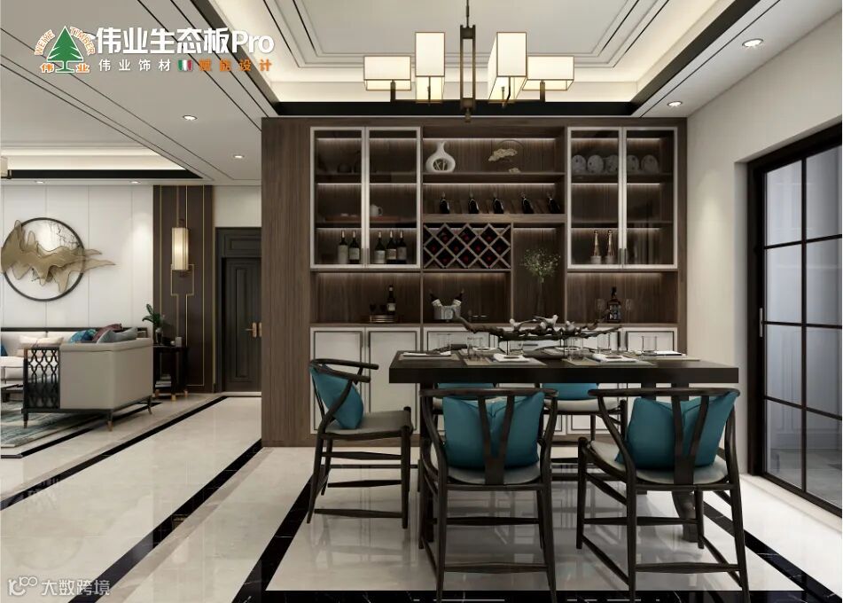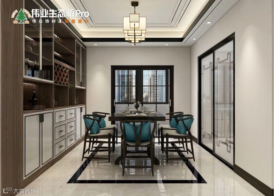 餐厅将中式符号与现代审美巧妙融合,221黄桃-超哑、211麻石白-火烧构成新中式的餐边柜,做分层收纳处理,上方摆放瓷器、名酒,下方收纳厨房物品,搭配经典大气的深色餐桌,让东方韵味呼之欲出,除了舌尖上酸甜苦辣,还有别致的中式情调,对于国人来说更有“味道”。