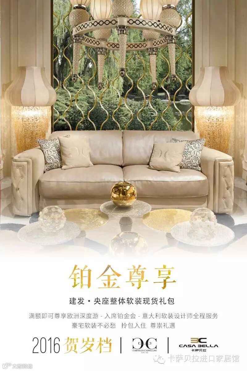 新年新家,名宅美居,卡萨贝拉特别呈现铂金待遇:豪宅整体软装尊享礼包。不必焦心漂洋过海的等待,一线品牌家居现货尊选,意大利设计师全程服务,免费送货上门安装,满额还有机会赢取欧洲深度游。豪宅软装不必愁,拎包入住,惬享生活。