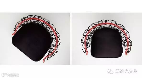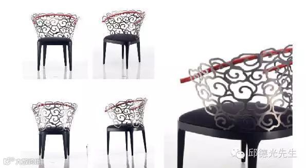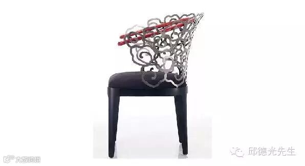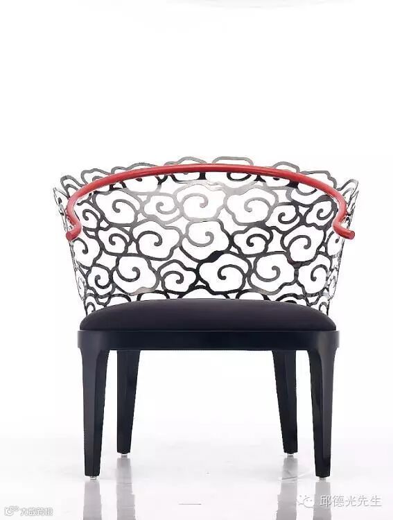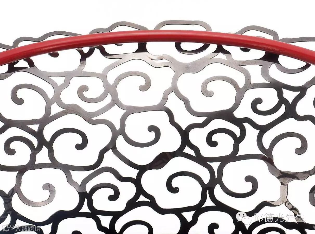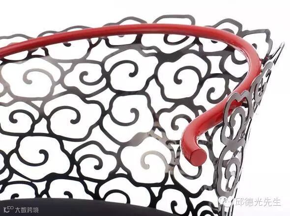 對於中國文化有著深厚的理解,並致力於將古老的文化圖騰轉化為現代設計語彙的邱德光在著手設計雲椅之際,便將雲紋所代表的哲學意涵、思想文化納入肌理,接著再透過3D雷射雕刻技術和老師傅的傳統手工藝勾勒出雲紋活潑靈動的線條,展現出鋼材如行雲流水般的意境;而珠紅的椅圈則象徵盤據雲頂的龍正待時而起。