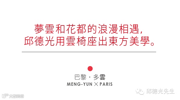 夢雲是邱德光最廣為人知的原創家具之一,但對於邱德光來說,夢雲不只是家具,而是一個傳承了中國傳統思想與精神的文化載體。這次,邱德光先生應邀參加於巴黎百花公園舉辦的第一屆巴黎國際藝術博覽會(Festival intertional des arts de Paris),並以藝術家身分帶著雲椅,於巴黎登場。