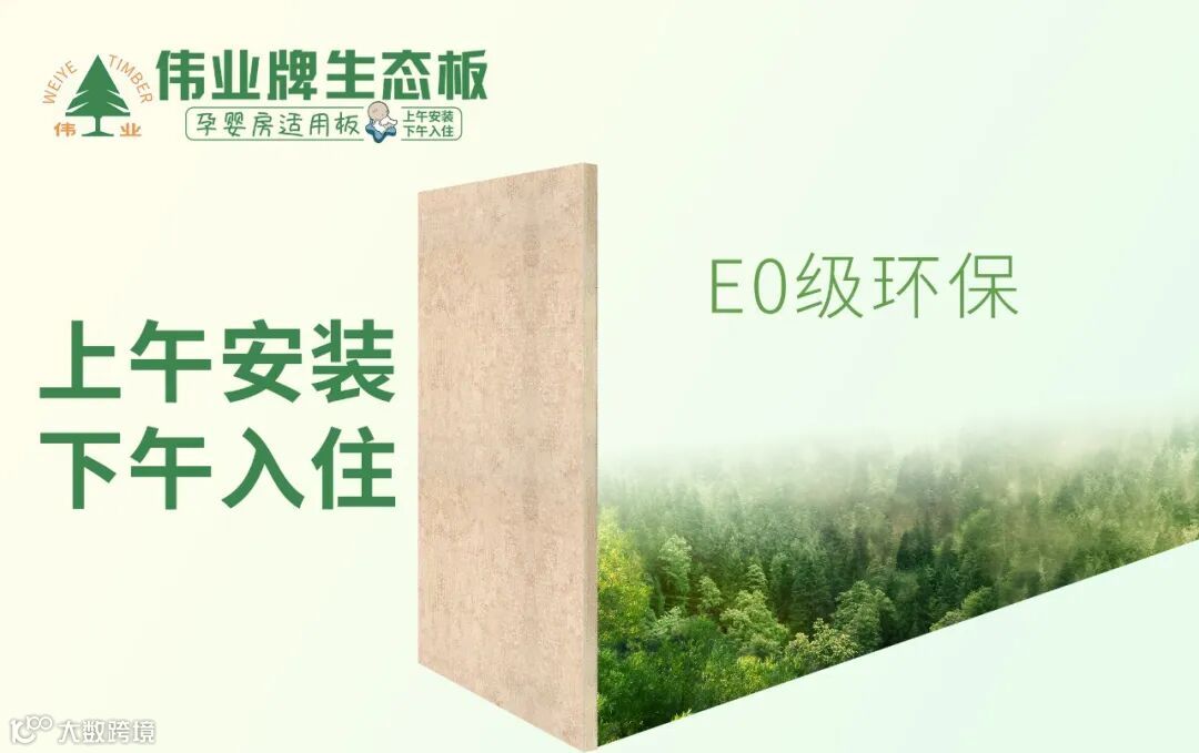 伟业牌生态板在硬质板材的基础上,高温压贴饰面,环保等级达到E0级,不需经涂漆工艺,免除甲醛、苯、VOC等有毒物质对业主健康的危害,做家装绿色健康、环保净味,上午安装,下午入住,为业主的健康添加一层保障。