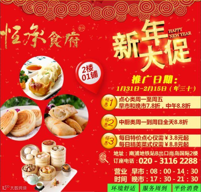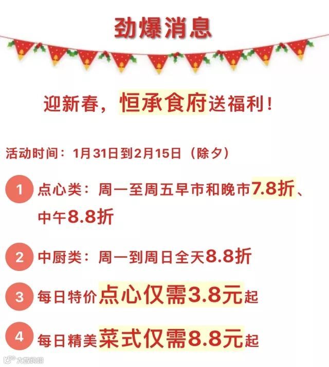 为回馈广大街坊朋友,恒承食府将于春节前推出全天候折扣活动,让广大食客放价过大年,感谢大家的支持与鼓励!
