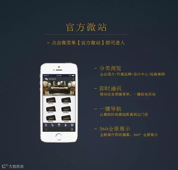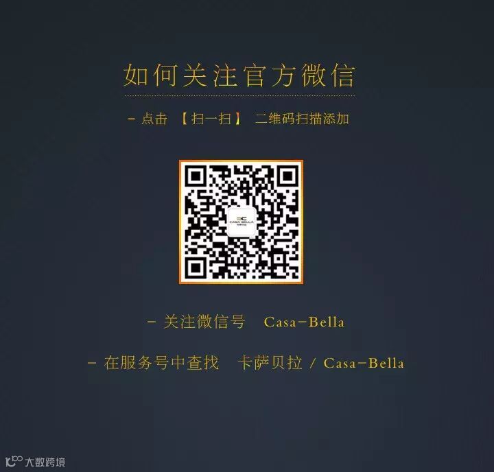 2014年4月,卡萨贝拉全新开启官微,轻点指尖扫描二维码关注或在服务号中搜索卡萨贝拉,即可享受强大的卡萨贝拉微信平台带来的多重贴心服务,感受全新的微时代体验。通过官微平台,卡萨贝拉不断将全球最新最全的时尚资讯、美居生活、创意设计、展会讯息、服务体验输入国内,传递高品质生活理念。
