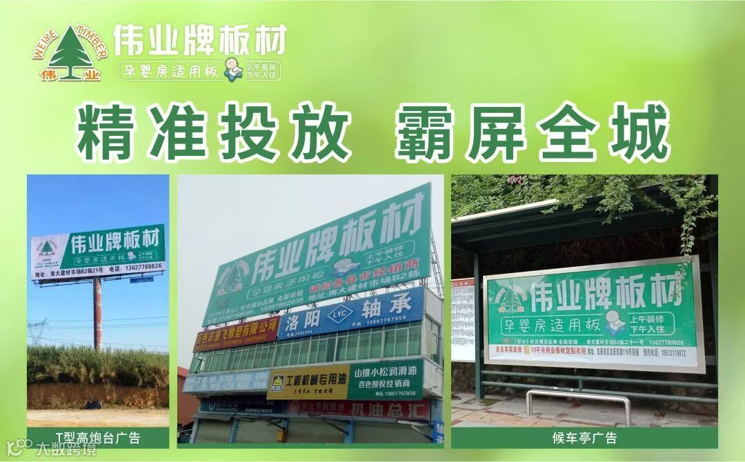 为了进一步扩大品牌影响力、提升知名度,2019年伟业牌板材在广西百色集中投放的T型高炮台广告、市场楼顶广告、候车亭广告等多类户外广告已正式全面上线。