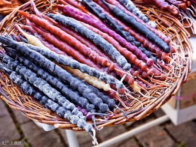 格鲁吉亚有得天独厚的葡萄种植条件,所以葡萄衍生的副产品格外多。外观酷似长香肠的丘尔其赫拉就是其中一种。其主要成分是葡萄汁和面粉,加入少量杏仁、核桃、榛子和葡萄干,并拧成香肠的形状风干制成。在格鲁吉亚街头,时不时就会看到挂满一整个橱窗的丘尔其赫拉,它也是索巴狂欢节上最受人追捧的甜点。