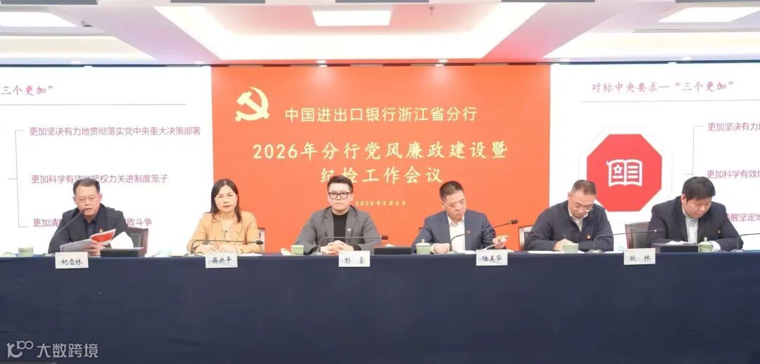 2月6日,进出口银行浙江省分行召开2026年党风廉政建设暨纪检工作会议。分行党委书记、行长彭豪同志全面总结过去一年分行全面从严治党和党风廉政建设工作情况,明确今年的重点任务。分行党委委员、纪委书记纪雪林同志全面总结过去一年分行纪检工作情况,对深入学习贯彻全行党风廉政建设和纪检工作暨警示教育大会精神及今年纪检工作任务作出部署安排。