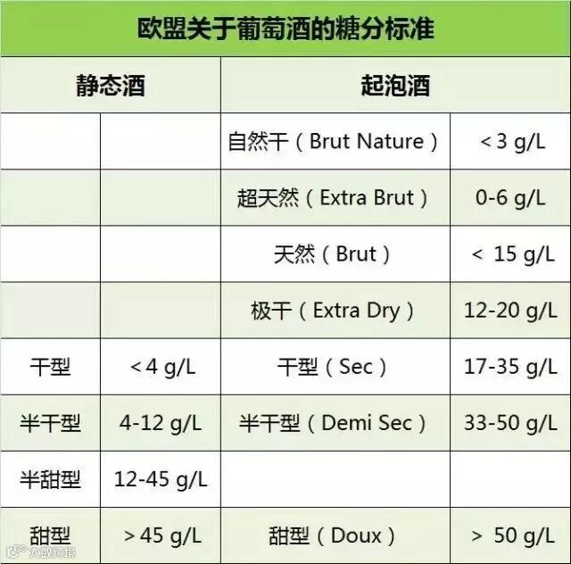 以上提到的一般只适用于静态酒,在欧盟标准中,起泡酒有另外一套适用的准则。如图: